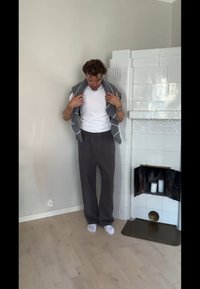 • Suéter de lana gris colgado sobre una camiseta blanca, combinado con pantalones grises holgados. Calcetines blancos. Pared de color claro con una chimenea de azulejos.