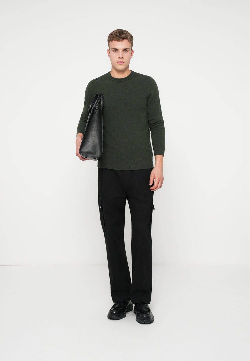 Una figura masculina se sienta en una silla verde, vistiendo una camisa blanca, una corbata a cuadros, un suéter verde oliva sobre los hombros, pantalones beiges y zapatos marrones.