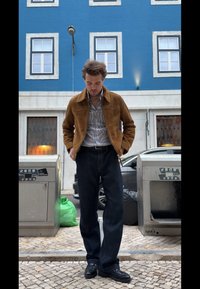• Hombre con chaqueta de ante marrón, camisa de rayas abotonada, pantalones negros y zapatos negros, de pie con las manos en los bolsillos en una calle adoquinada.