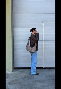 Chaqueta marrón de gran tamaño, camiseta sin mangas blanca, jeans anchos de mezclilla azul claro, gorro gris y zapatos negros. Lleva un bolso de hombro gris. Fondo de pared texturizada.