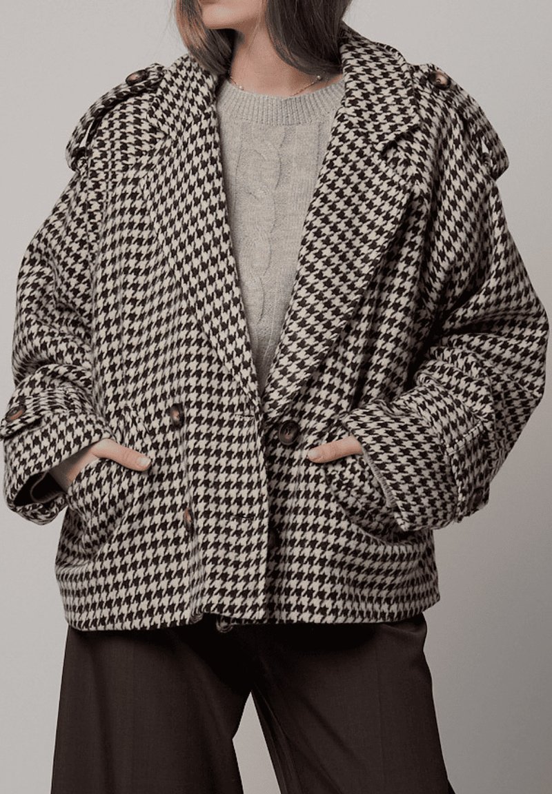 Abrigo oversized de mezcla de lana con patrón de pata de gallo en blanco y negro, con cierre de doble botonadura y grandes bolsillos delanteros.