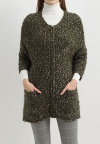 Cárdigan largo y oscuro con textura, con detalles en blanco y bolsillos. Material suave y esponjoso; diseño de frente abierto; llevado sobre un cuello de tortuga blanco.