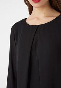 Vestido negro de manga larga en tejido ligero con un corte relajado, escote redondeado y sutiles detalles plisados en la parte frontal.