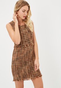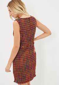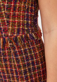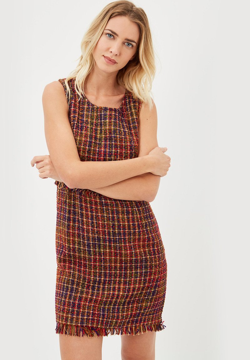 Vestido de tweed multicolorido con un patrón texturizado y tejido. Diseño sin mangas, escote redondo y con borde de flecos en el dobladillo.
