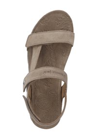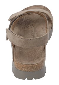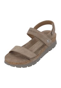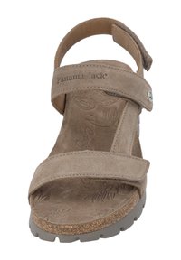 Sandalia de ante beige con dos correas ajustables, plantilla de corcho y suela de goma texturizada. Diseño ligero con una silueta minimalista.