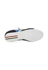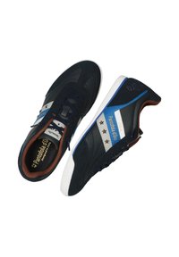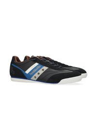 Zapatilla baja negra y azul con suela blanca, forro interior marrón, detalles de estrellas, texto "Pantofola d'Oro" y parte frontal con cordones.
