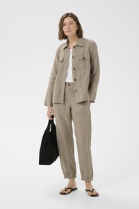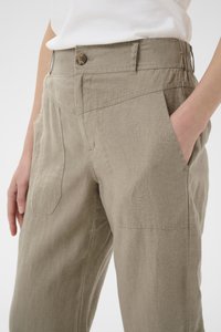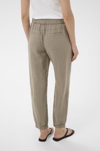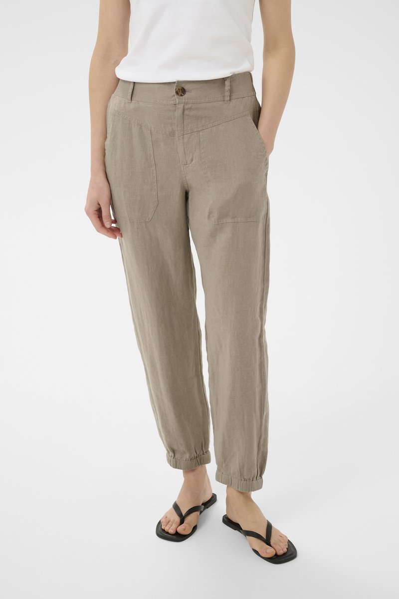 Persona con pantalones casuales beige con bolsillos aplicados y puños elásticos, combinados con chanclas negras y una camiseta blanca sin mangas.