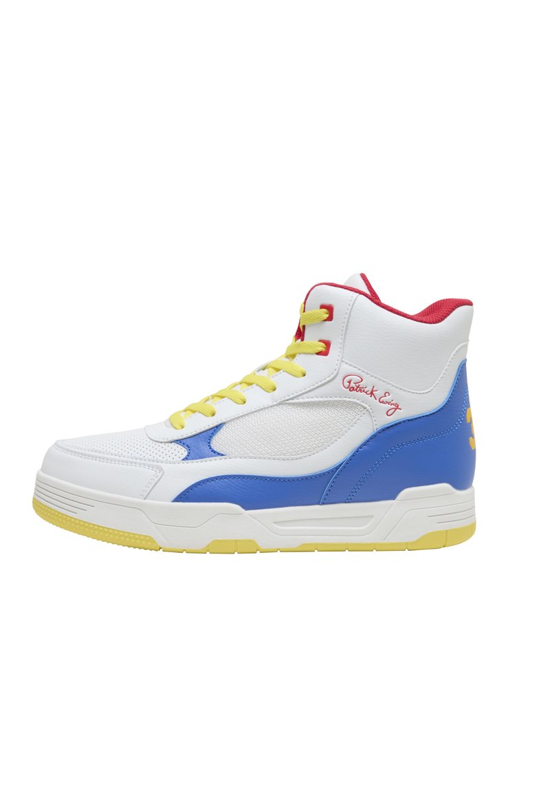 Zapatilla blanca de caña alta con detalles en azul y amarillo, cordones amarillos, forro interior rojo y la firma "Patrick Ewing" en el lateral.