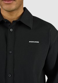 Hombre con camisa negra a rayas acanaladas de manga larga abotonada y pantalones a juego con pequeño logo blanco "PEGADOR" en el pecho y el muslo.