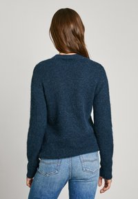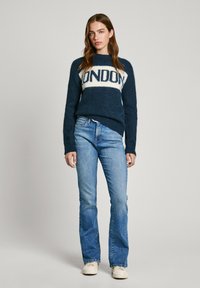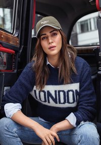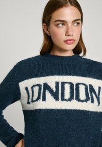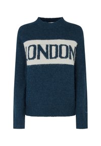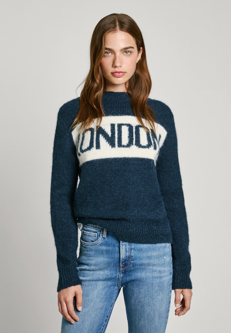 Suéter de punto azul marino con una banda blanca que lleva el texto "LONDON". Cuello redondo y mangas largas con puños de canalé.