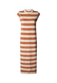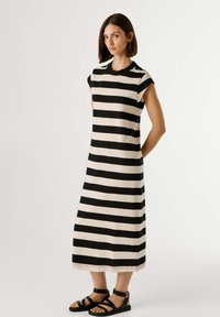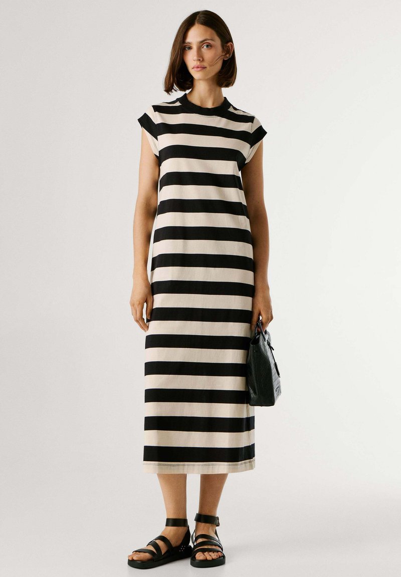 Mujer vistiendo un vestido midi a rayas horizontales en negro y beige, sosteniendo un bolso negro y usando sandalias negras, de pie frente a un fondo liso.