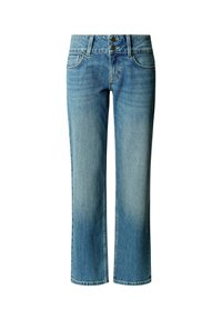 Vaqueros de denim azul oscuro con corte recto, que presentan un cierre de doble botón, bolsillos delanteros y detalles de costura en naranja.