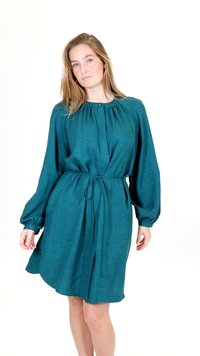 Vestido azul verdoso con cinturón, cuello con solapa y mangas largas, confeccionado en un tejido texturizado y con un dobladillo ligeramente acampanado. Combinado con tacones beige.