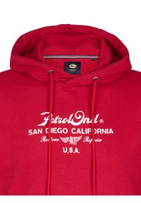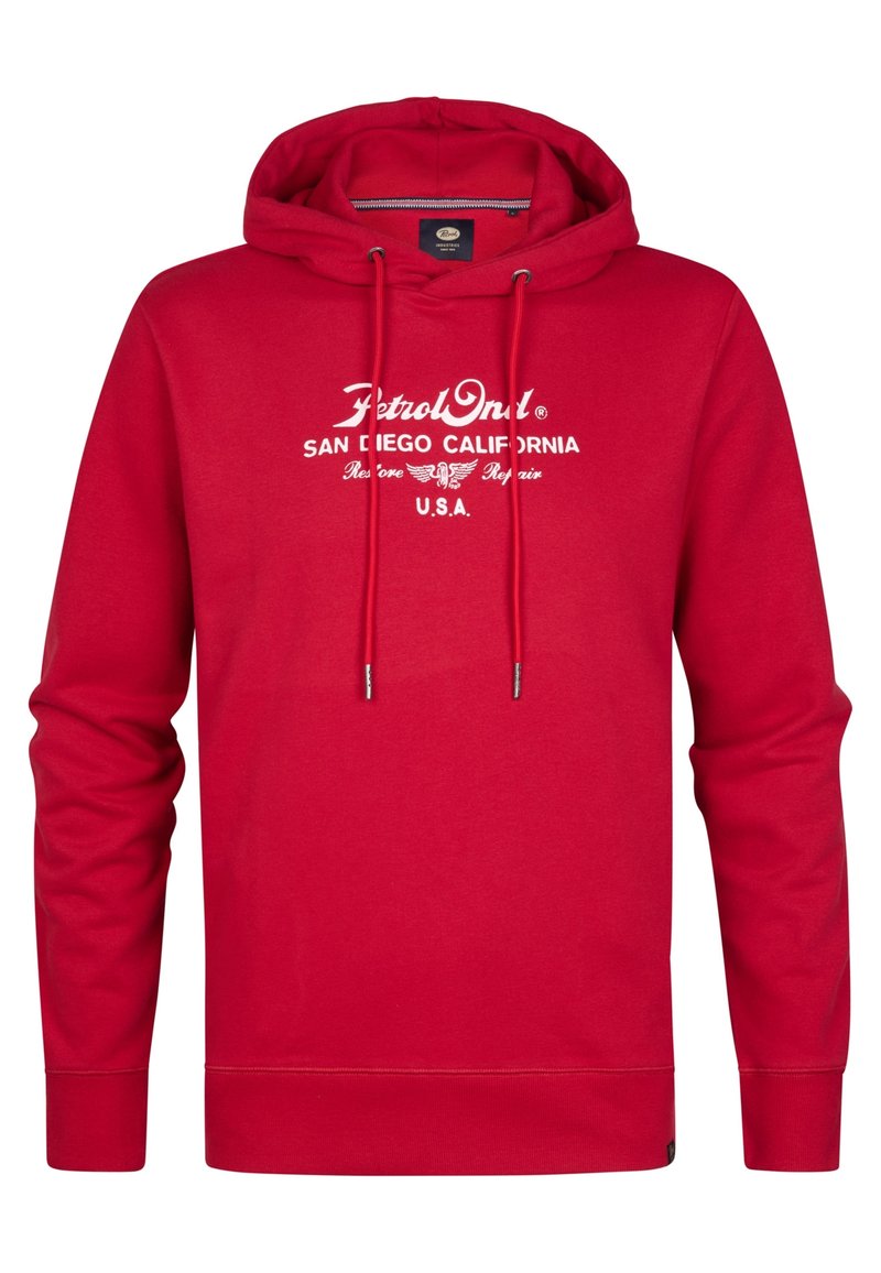 Sudadera roja con capucha con texto blanco "Petrol Only San Diego California Restore Repair U.S.A." en el pecho, cordones y puños y dobladillo acanalados.