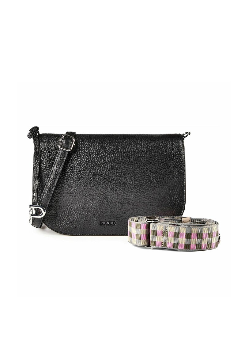 Bolso bandolera de cuero negro texturizado con correa ajustable y correa de tela a cuadros separada en rosa, verde y beige sobre fondo blanco.
