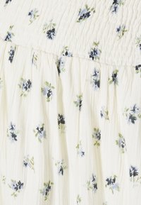 Falda blanca con estampado floral, cinturilla fruncida, con pequeñas flores azules y verdes, diseño plisado y textura de tela ligera.