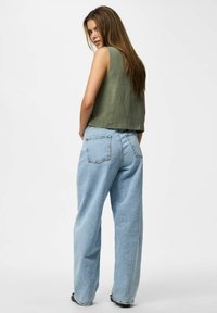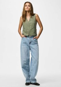 Mujer con cabello liso castaño claro que lleva un chaleco sin mangas verde oliva con botones y vaqueros azul claro de talle alto.