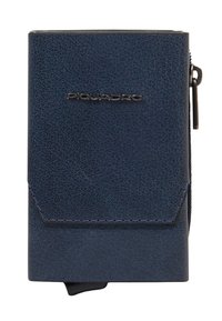 Cartera de cuero negro texturizado con cremallera metálica en el lateral y logo metálico de la marca "Piquadro" en la solapa frontal.