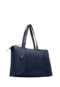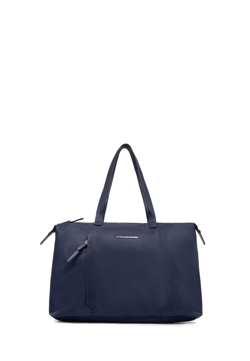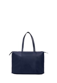 Bolsa tote rectangular azul marino con dos asas y bolsillo delantero con cremallera, con logotipo pequeño en plata.