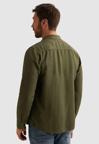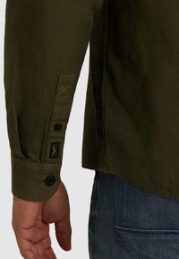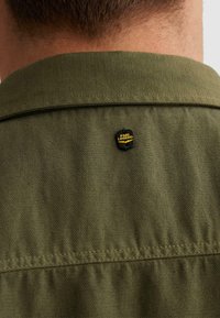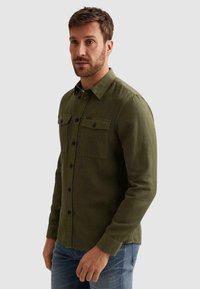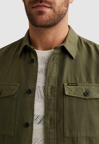 Hombre con camisa verde oliva de botones sobre camiseta blanca con estampado y vaqueros azules, de pie frente a un fondo gris claro.
