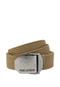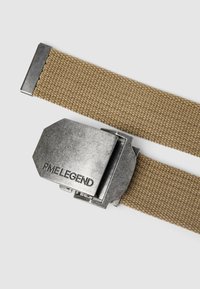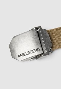 Cinturón de tela tejida color beige enrollado con una hebilla rectangular de metal plateado grabada con "PME LEGEND."