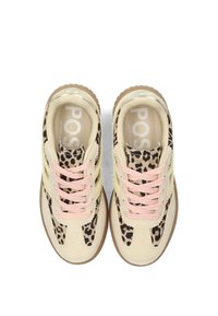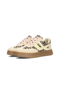 Zapatilla deportiva baja de ante beige, con acentos amarillos, cordones rosas, tela estampada de leopardo y una gruesa suela de goma marrón.