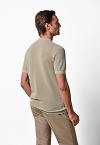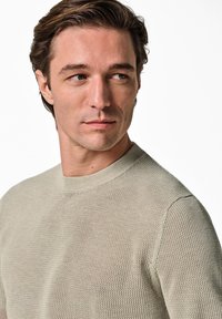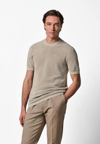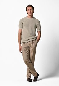 Hombre con cabello castaño, vistiendo una camiseta de punto beige de manga corta y pantalones a juego beige, de pie contra un fondo blanco.