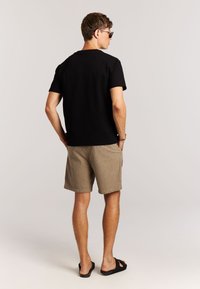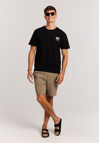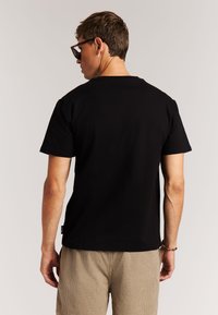 Camiseta negra de algodón con cuello redondo, mangas cortas y un pequeño parche multicolor en el lado izquierdo. El modelo lleva gafas de sol.
