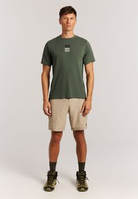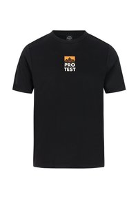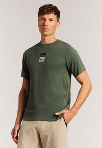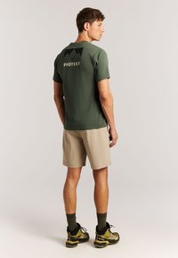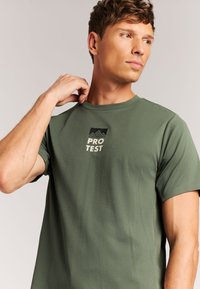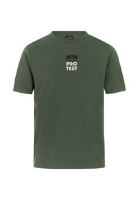 Camiseta verde de manga corta hecha de tela texturizada con un logo de montaña negro y el texto "PROTEST" en la espalda; diseño ligero y transpirable.
