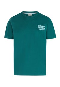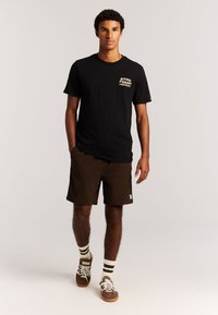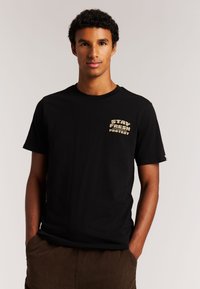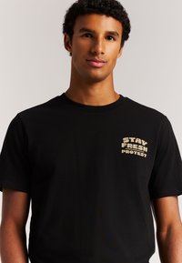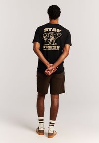 Camiseta negra de algodón con un gran gráfico color crema en la espalda que muestra un pez y una tabla de surf con el texto "STAY FRESH".