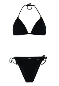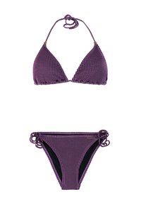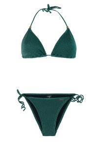 Bikini verde texturizado con top triangular, braguitas con lazos laterales y detalles de cuentas. Modelo con un collar de perlas como accesorio.