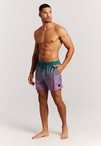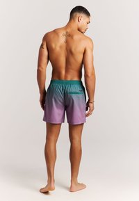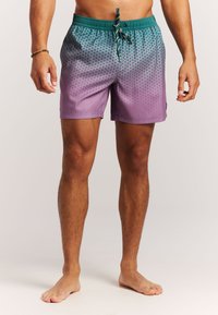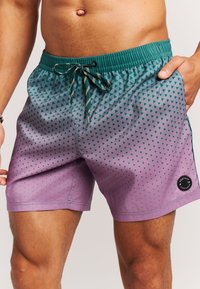 Bañador corto con un diseño degradado de color verde azulado a púrpura, patrón de puntos, cintura elástica con cordón y textura cepillada.