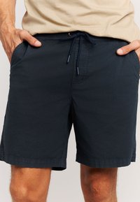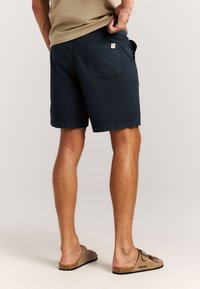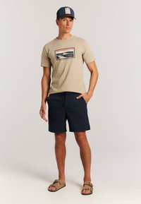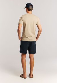 Hombre con sandalias beige y pantalones cortos negros hasta la rodilla, de pie con las piernas ligeramente separadas contra un fondo liso.