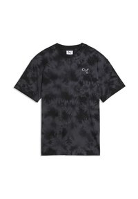 Camiseta de manga corta de Puma, con patrón tie-dye en tonos turquesa y más oscuros, material de algodón, cuello redondo, pequeño logo en el pecho.