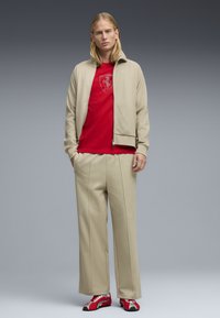 Joven de pie con las manos en los bolsillos, vistiendo un chándal beige, camiseta con el logo rojo de Ferrari y zapatillas rojas y blancas sobre un fondo gris.