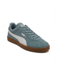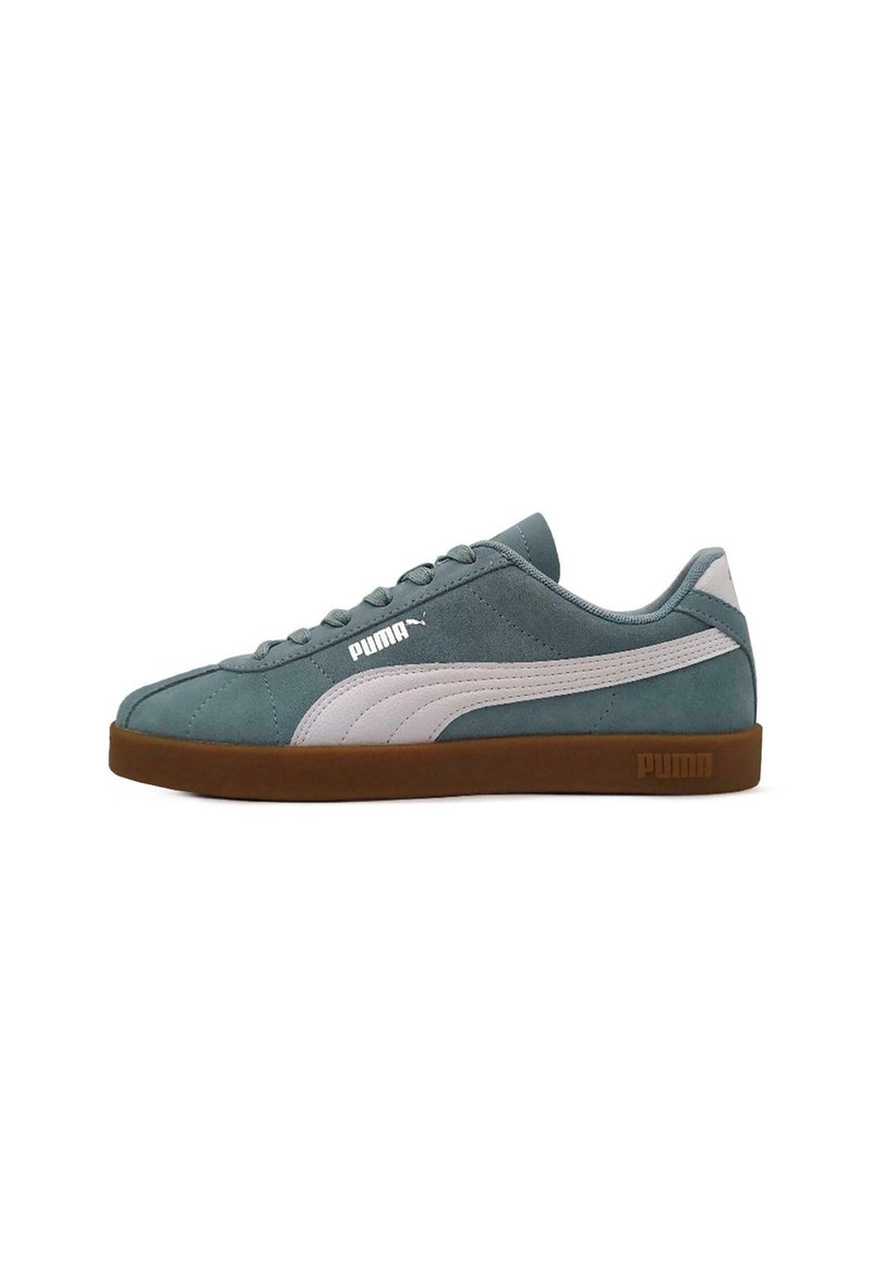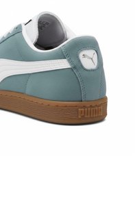 Zapatilla Puma de corte bajo en ante color verde azulado con raya blanca y suela de goma color caramelo, vista lateral sobre fondo blanco.
