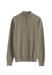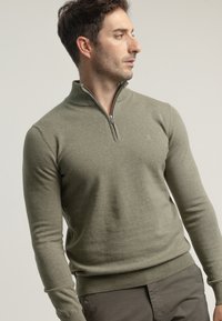 Jersey de punto verde oliva con cremallera de un cuarto, tejido de punto, puños y dobladillo acanalados, con un pequeño logo bordado en el lado izquierdo del pecho.