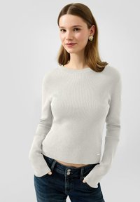 Mujer joven con un suéter gris claro acanalado y jeans azul oscuro, con las manos en los bolsillos, sonriendo suavemente frente a un fondo liso.