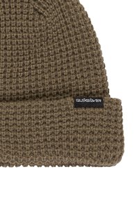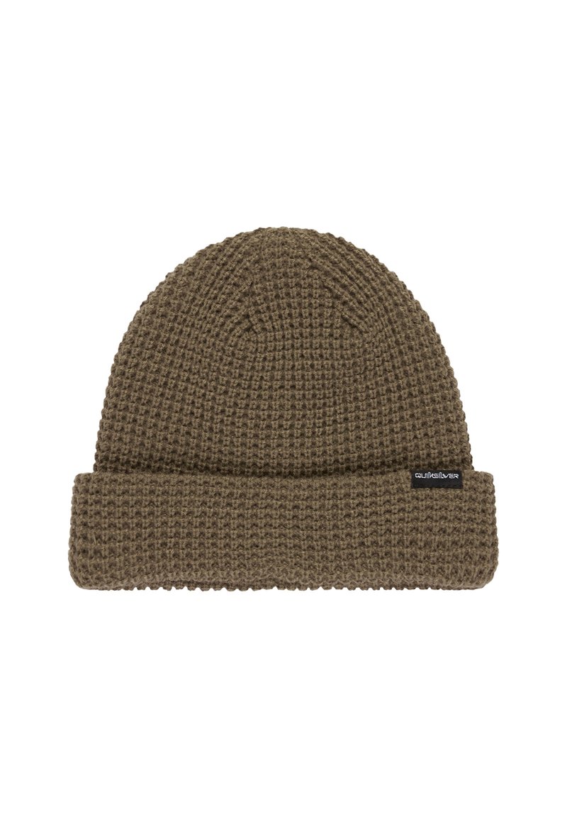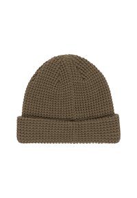 Gorro de punto marrón con un puño doblado y un patrón texturizado. Presenta una etiqueta de marca en el lateral. Probablemente de material de algodón o lana.