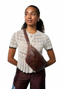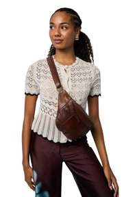 Bolso bandolera de cuero marrón con un diseño redondeado, acabado texturizado y bolsillo exterior con cremallera, llevado sobre un suéter de punto color crema y pantalones granate.