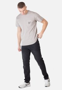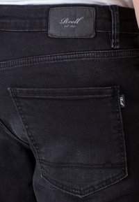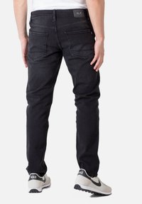 Jeans de mezclilla negros con un corte slim, diseño de cinco bolsillos y desgaste sutil. Combinados con zapatillas deportivas de color claro.