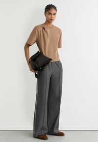 Camiseta marrón de manga corta con un detalle de nudo en el hombro, confeccionada en tela suave; combinada con pantalones grises de corte afilado, que destacan una silueta relajada.