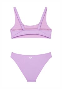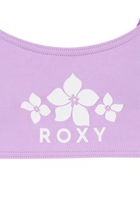 Bañador de dos piezas lila con logo floral y texto "ROXY" en la parte superior, que presenta un escote redondo y braguitas de bikini a juego.