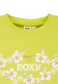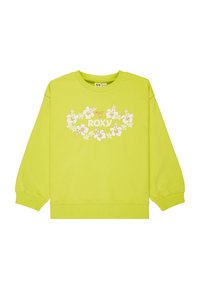Sudadera de manga larga color verde lima con estampado floral blanco y texto "ROXY" centrado en el frente, con puños y cinturilla acanalados.