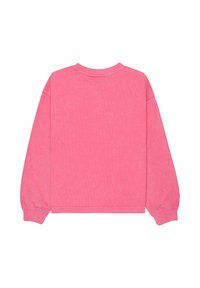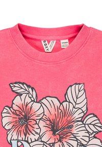 Suéter de manga larga color rosa brillante con puños acanalados, con un gran diseño floral y el texto "Roxy" en azul claro en el frente.