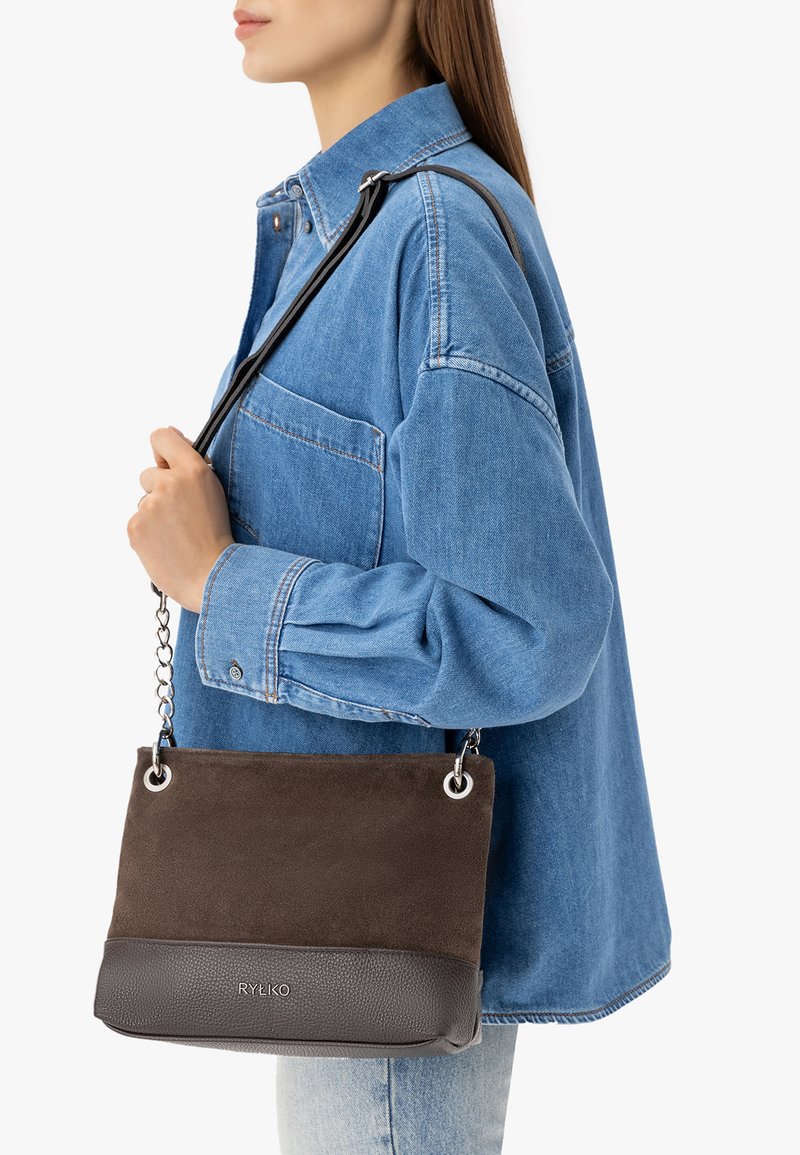 Mujer con camisa azul de mezclilla que lleva un bolso de hombro de ante y cuero marrón con cadena y correa negra.