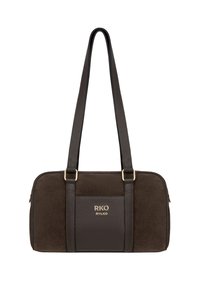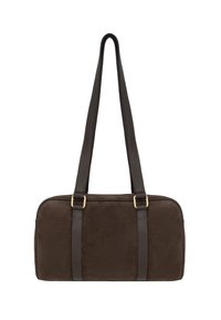 Bolso rectangular de ante y cuero marrón oscuro con dos asas para el hombro y logo dorado en el panel frontal.