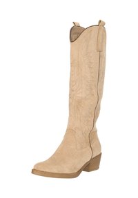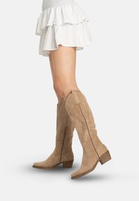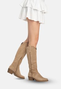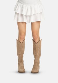 Mujer con botas vaqueras de ante marrón claro hasta la rodilla, con cremalleras laterales y falda corta blanca con volantes.