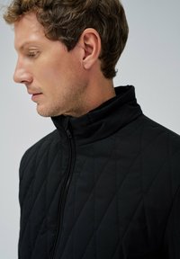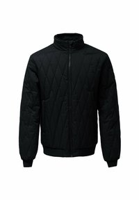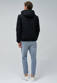 Chaqueta negra acolchada con cierre delantero, capucha y puños de canalé. Presenta un patrón de diamantes y una silueta ajustada, combinada con jeans azul claro.