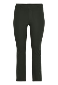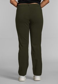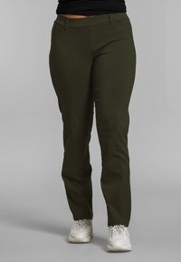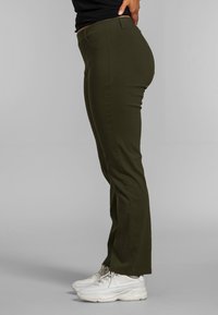 Persona con pantalones de pierna recta color verde oliva y zapatillas blancas, de pie frente a un fondo gris liso.